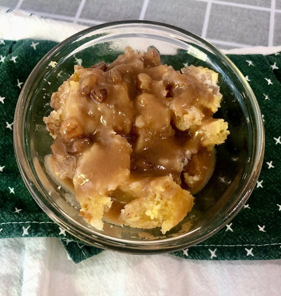 Stir 2 cubes salted butter, 1 cup half & half and 1 cup brown sugar together in a heavy saucepan; bring to a boil. Reduce heat to low, simmer for 5 minutes then stir pecans into the cream mixture, and pour over bread pudding to serve.