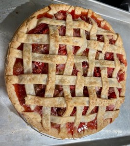 - Roll out disks into ~12 inch circles, about ⅛” thick. Carefully transfer dough into 9” pie plate, and trim sides, leaving ¾” overhang. Roll out remaining dough for top crust.