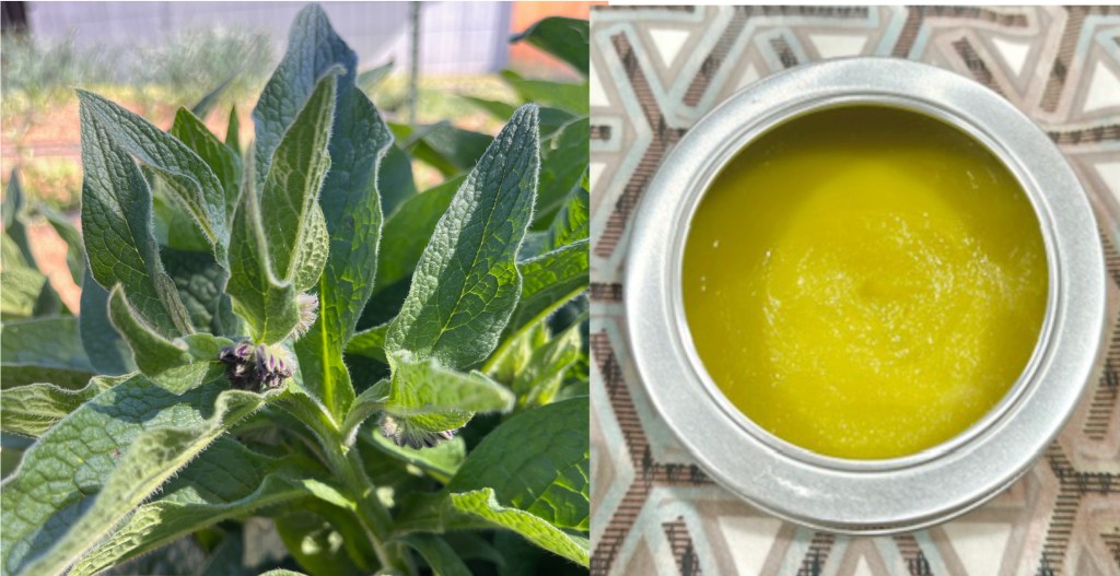 Comfrey is an amazing herb you can grow in your garden! There are so many uses. One thing that I love to make is Comfrey Salve. (see recipe below).